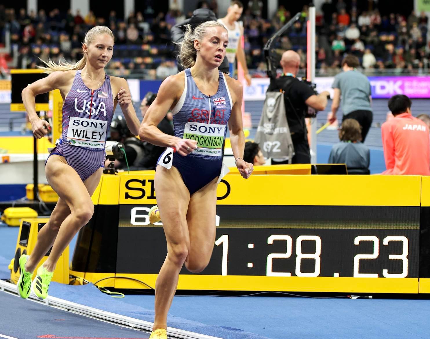 American Addy Wiley saw what Hodgkinson was doing and quickly took advantage of the situation. She attached herself to Hodgkinson and, like a Formula One driver, she gladly took the two all the way to the finish. She clocked 1:58.75, an indoor personal best.