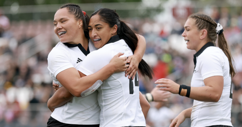 Mererangi Paul #14 of the New Zealand Black Ferns is congratulated by Kaipo Olsen-Baker #8 of the New Zealand Black Ferns after she scored a try against the USA Eagles for a try during their match in the Pacific Four Series at Heart Health Park on April 11, 2026 in Sacramento, California. (Photo by Ezra Shaw/Getty Images)