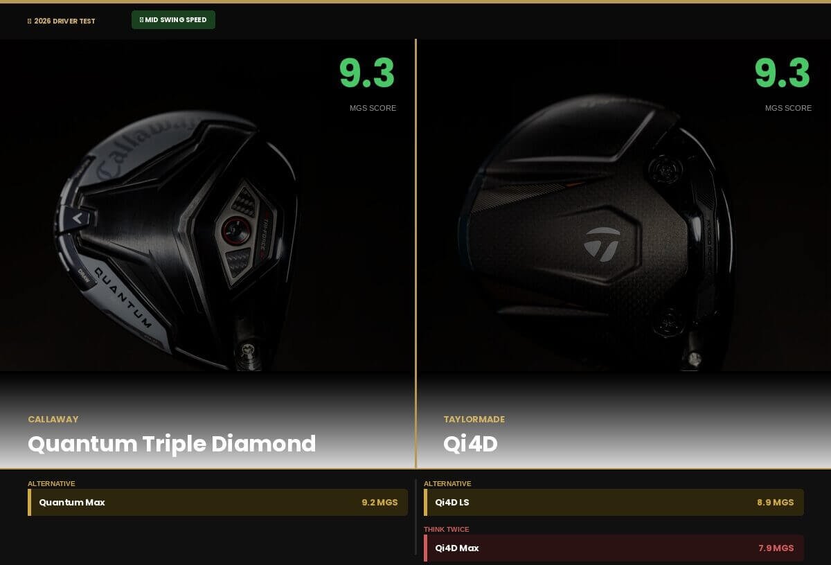 TaylorMade’s best option here: The standard Qi4D. It matches the Quantum Triple Diamond at the top of the mid speed category with a 9.3 MGS score and leads the TaylorMade range on playable rate at 92.8 percent. For most mid swing speed golfers, it is the right starting point.