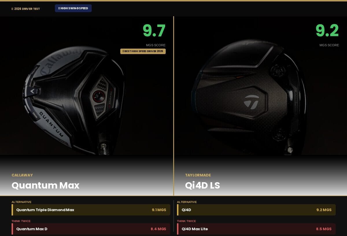 The data tells a clear story across all three speed categories. Callaway’s Quantum range is the stronger overall lineup. It leads at high speeds with the best driver in our 2026 test, dominates at mid speeds and stays competitive at slow speeds. TaylorMade’s Qi4D wins on overall MGS score and has specific models that are genuinely hard to argue with at every speed tier. Neither brand disappoints. But the right choice between them comes down to your swing speed and your priorities.