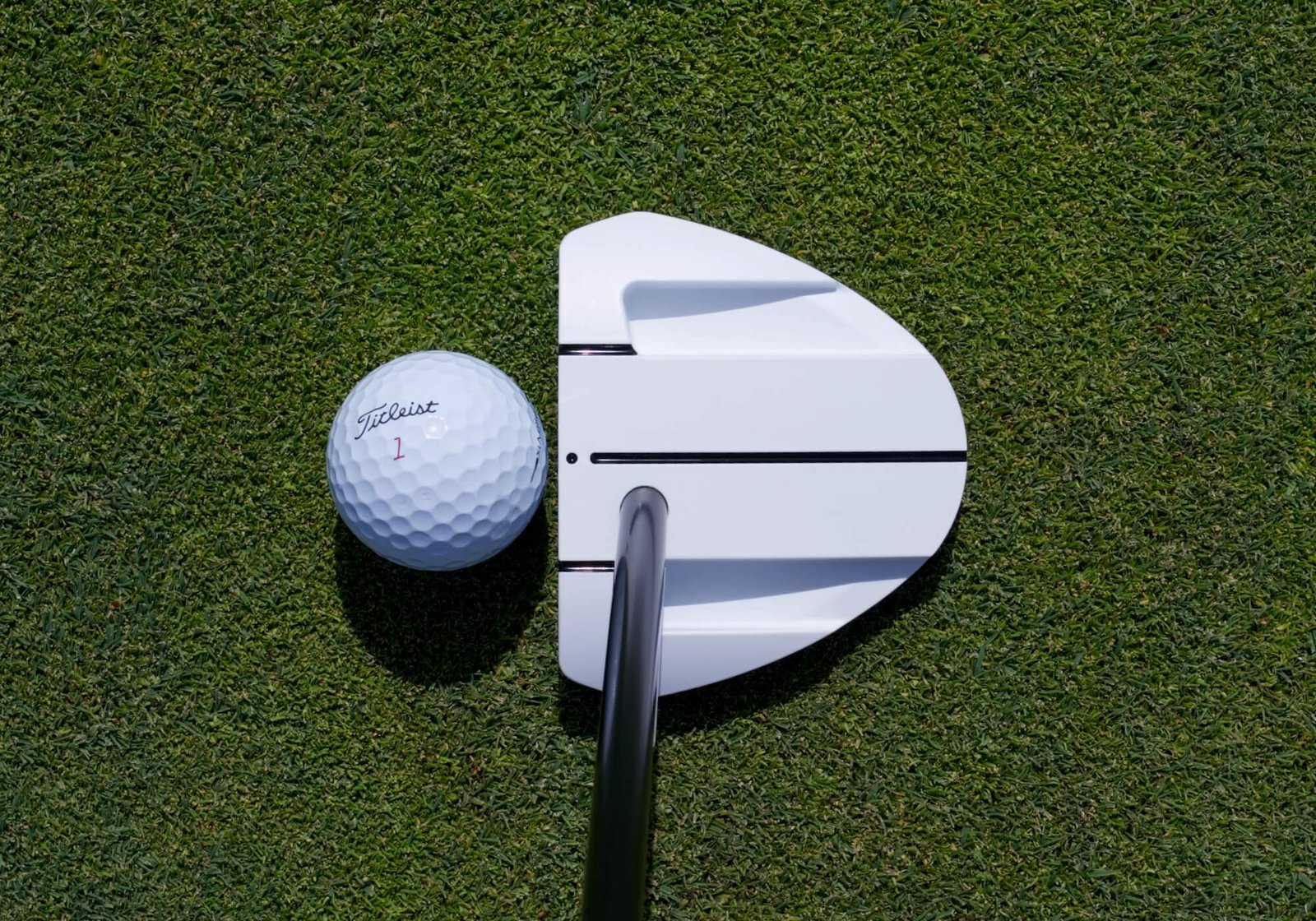 That dot at the front becomes the final focus point before execution. Center the dot on the middle of the ball, then make the putt.