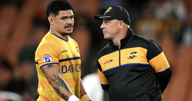 Du’Plessis Kirifi of the Hurricanes talks with head coach Clark Laidlaw of the Hurricanes ahead of the round 10 Super Rugby match between Chiefs and Hurricanes at FMG Stadium Waikato, on April 18, 2026, in Hamilton, New Zealand. (Photo by Hannah Peters/Getty Images)