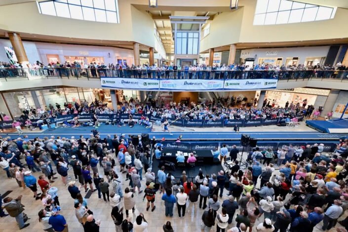 DES MOINES, IOWA, April 20 – Indoor pole vault returned to the Des Moines metro on Monday night after a 2-year hiatus. Some of the world’s best pole vaulters entered Jordan Creek Town Center with defending men’s champion KC Lightfoot and women’s world No. 2 Sandi Morris leaving atop the podium to kick off the week-long running of the 116th Drake Relays.
