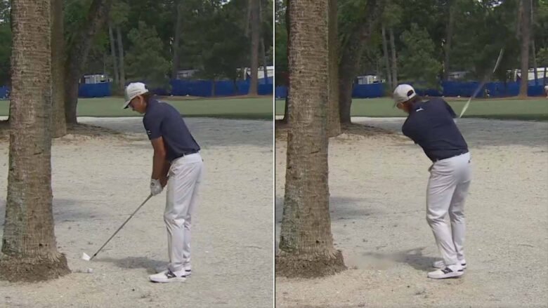 Fowler was able to make clean contact on the punch shot, sending his ball 97 yards down and across the fairway, eventually settling in the right rough with a perfect angle to the green.