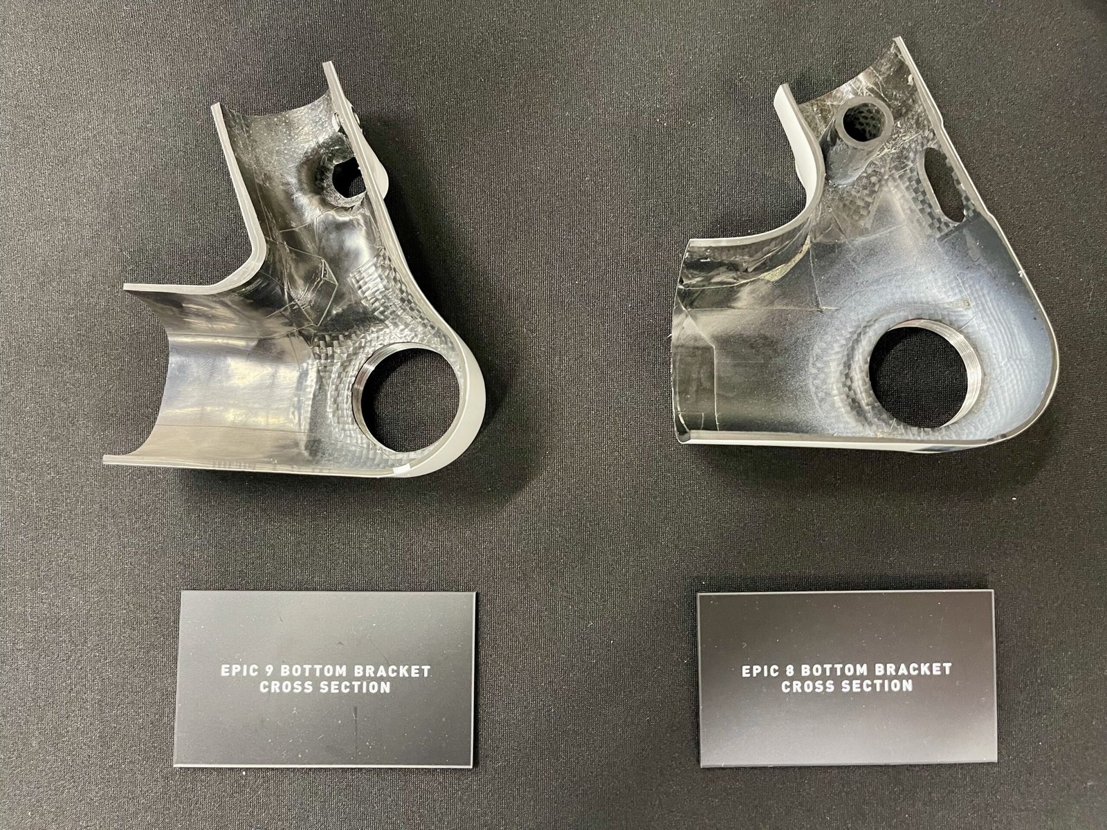 The Epic 9 frame is 129g lighter than the nearest competitor, and the total system sheds 206g compared with the Epic 8. The through full-frame FEA optimization and a lot of very intentional trimming.