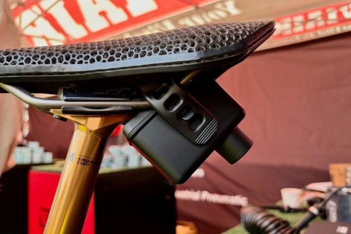 While the number of electric mini-inflators has grown exponentially in the past year and a half, we haven’t really seen many solutions for carrying them on the bike. Sure, they fit easily enough in a jersey pocket, hydration vest, some saddle bags, frame bags, and various other places. But the rectangular shape may not fit into some bikes’ downtube storage compartments, saddle bags, or it can feel uncomfortable in a pocket against the body.