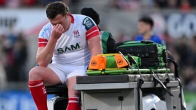 Ireland rookie’s recall 1 of 3 changes for Ulster ahead of La Rochelle mens challenge-cup Angus Bell of Ulster leaves…