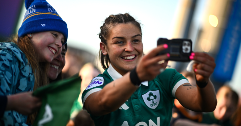 Galway , Ireland – 18 April 2026; Ireland captain Erin King with supporters after the Women’s Six Nations Rugby Championship match between Ireland and Italy at Dexcom Stadium in Galway. (Photo By Shauna Clinton/Sportsfile via Getty Images)