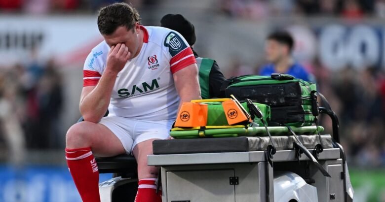 Angus Bell of Ulster leaves the pitch with an injury during the United Rugby Championship match between Ulster and Leinster at Affidea Stadium in Belfast. (Photo By Ramsey Cardy/Sportsfile via Getty Images)