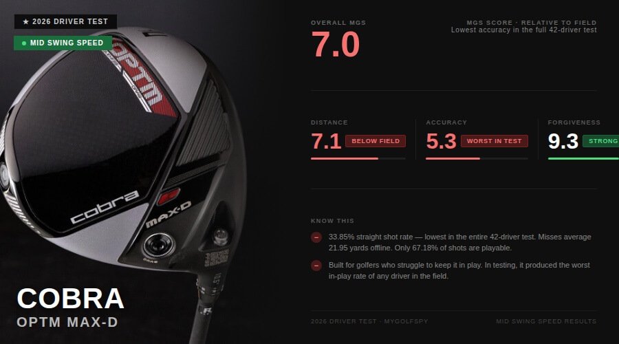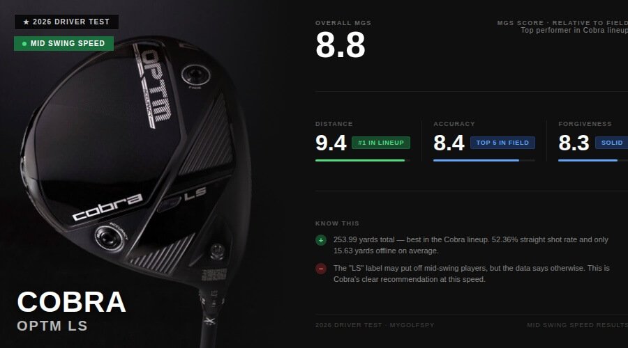 The COBRA OPTM lineup isn’t a cluster of similarly performing drivers with small trade-offs between them. The LS is the driver to put in your hands. Here are the complete mid swing speed driver test results if you want to explore brands outside of COBRA: Best Drivers for Mid Swing Speeds 2026.