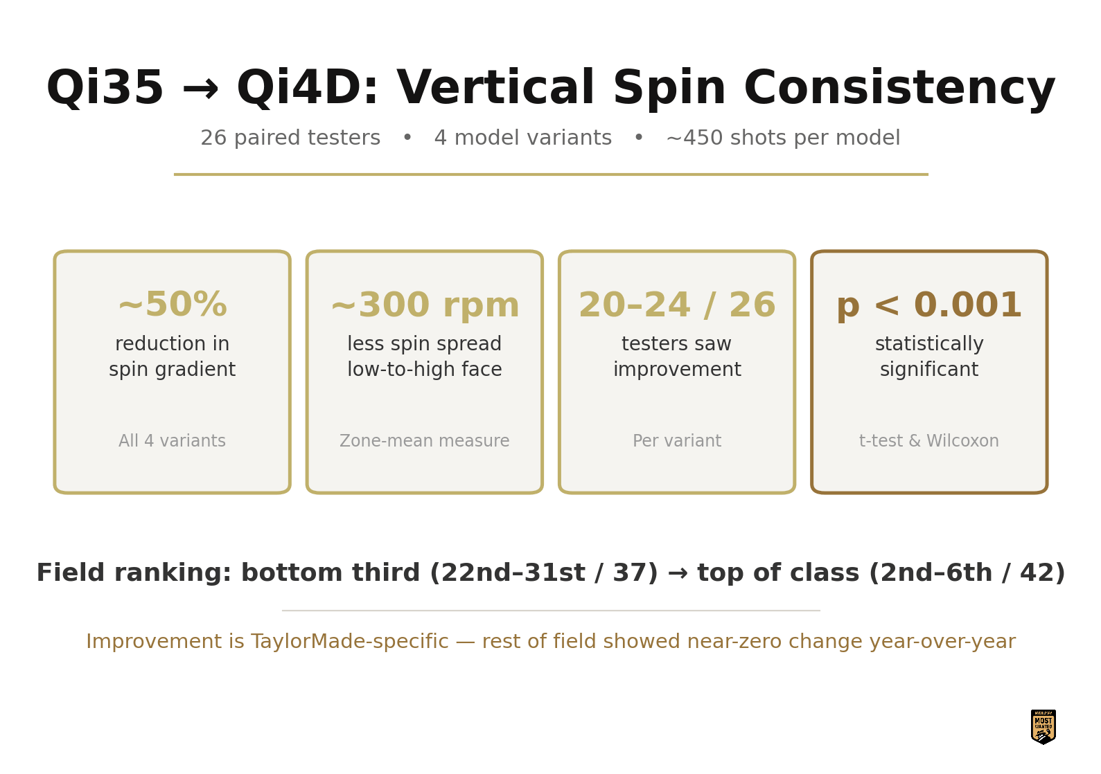TaylorMade said they fixed the spin consistency problem. The data strongly suggests they did just that. The improvement is large, it’s consistent across all four models, it shows up in the vast majority of individual testers, and it’s statistically significant by every measure we applied. TaylorMade went from the bottom third of the field in spin consistency to the top of it in a single product cycle.